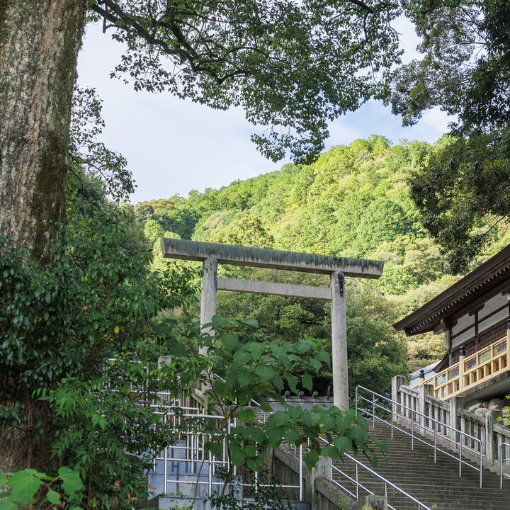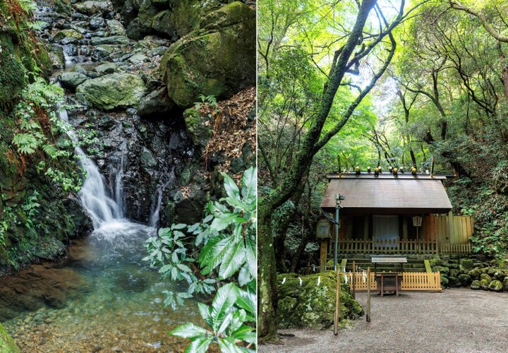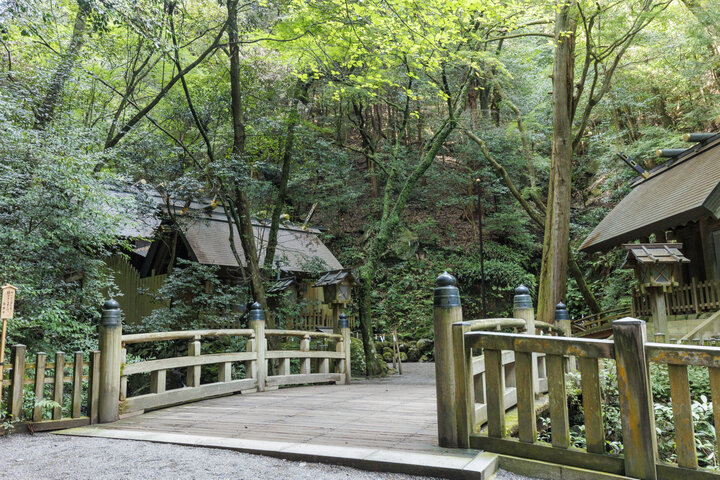 主祭神は、天照大神の御子神である天津彦根命(あまつひこねのみこと)。木漏れ日が差し、神秘的な雰囲気をたたえる境内を進んでいくと、滝が流れ、その奥に本宮が鎮座しています。周囲には、天津彦根命の母神・天照大御神を祀る神明社、御子神を祀る別宮、妹神を祀る美御前社などのお社が点在しています。