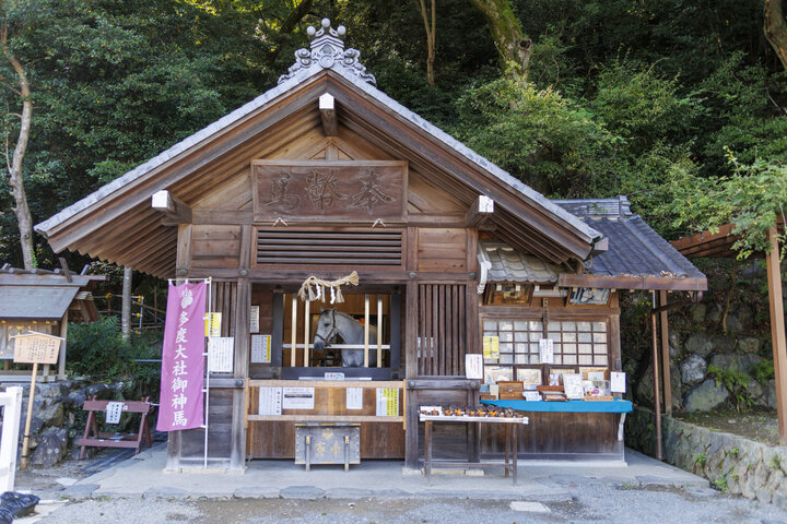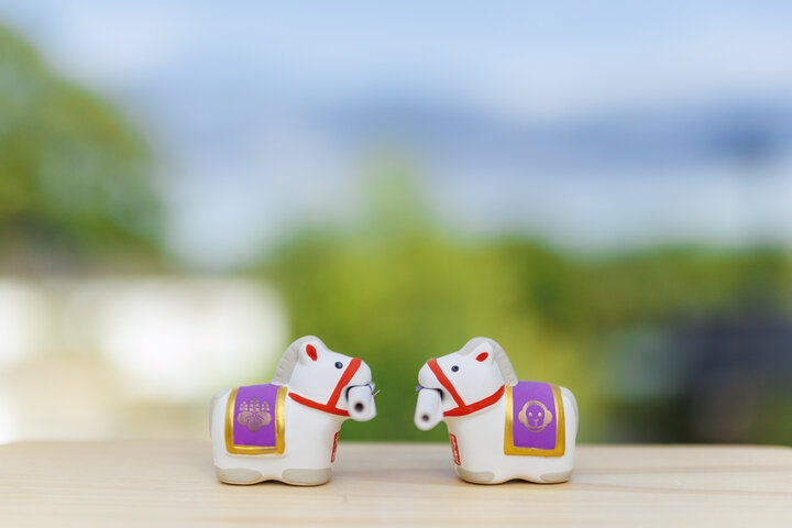 授与所では、白馬伝説にちなみ、馬をモチーフにした絵馬や、おみくじ、御朱印など多彩な御利益アイテムが授かれます。 大吉よりもラッキーな「大大吉」まである「しろうま水みくじ」は、境内中ほどの御手洗所(みたらしじょ)で清流に浸して運勢を占います。きれいに結べば白馬の形になるのが素敵です。