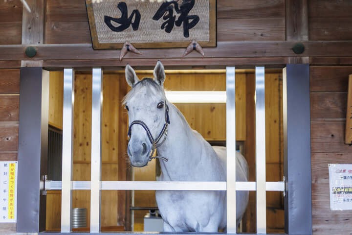 元競走馬のサラブレッド「錦山」はみんなの人気者。1皿100円で人参をあげることもできる