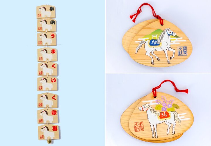 左:「うまくいく」の語呂から9つの絵馬を連ねる「馬九行絵馬」 右:桑名産のはまぐりにあやかり、つがいの白馬を描いた「貝合わせ絵馬」