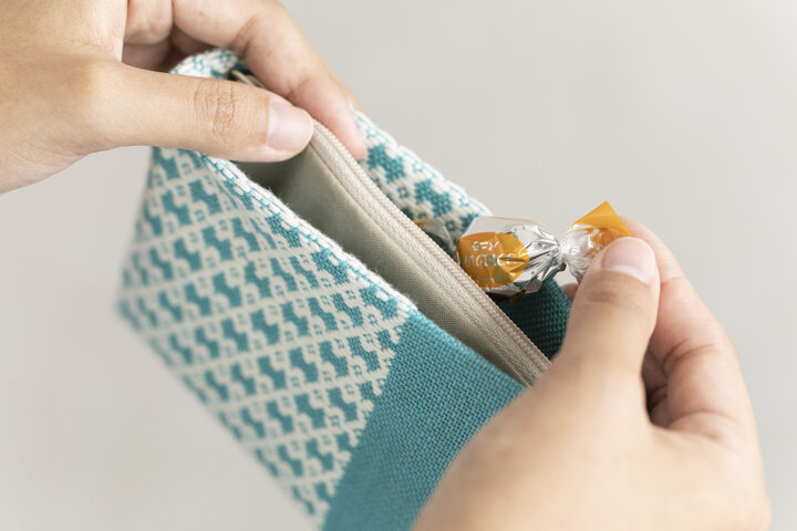 内布つきで形が崩れにくく、視認性も◎。こぎん刺しの凹凸が小物をやわらかく守ります
