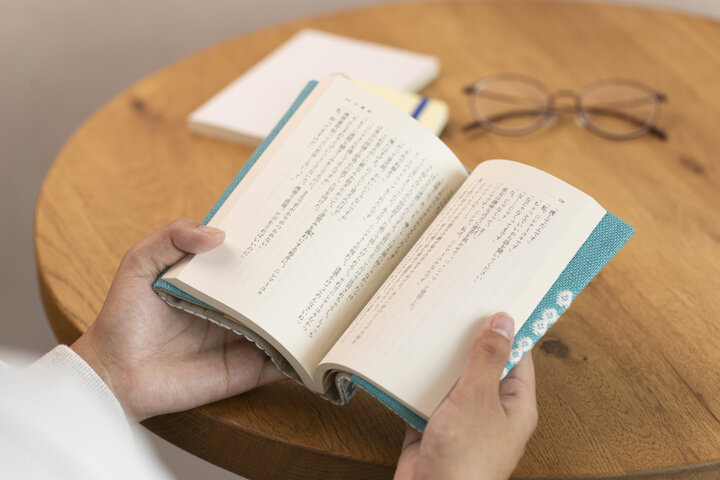 ほどよい張りのある生地が本を包み、頁をめくる手になじむ心地よさ。こぎん刺しの凹凸が指先にやさしく触れます
