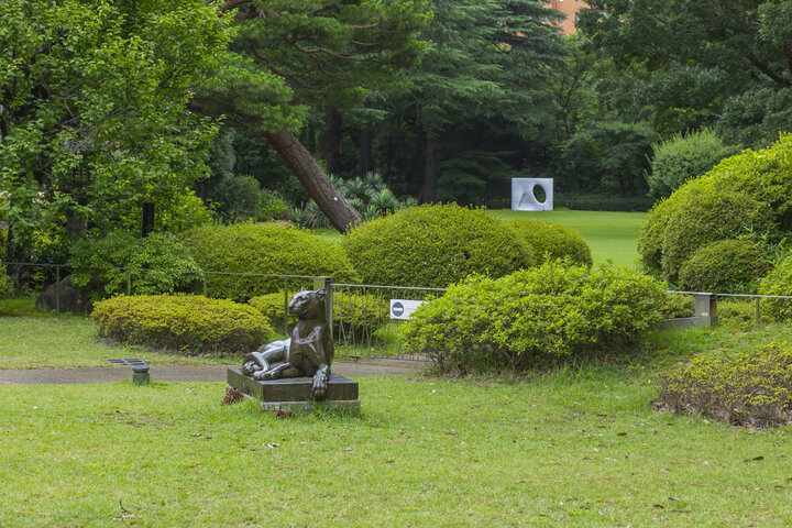手前はエドゥアール=マルセル・サンドの「横たわる豹」、奥は安田侃の「風」の彫刻