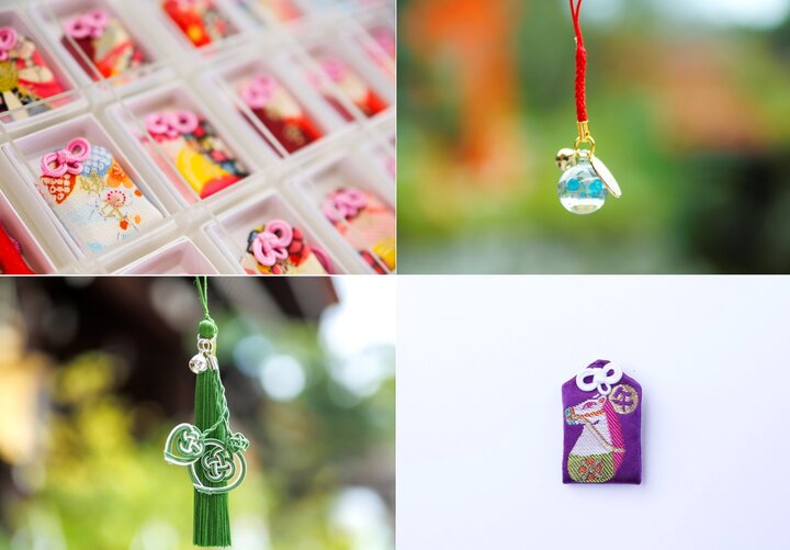 左上から時計回りに、ちりめん製の「媛守」1000円、御神水入り「水守」1000円、「干支守」500円、水引製の葵を添えた「逢ふ結」2000円
