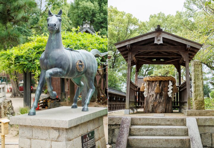 本宮には、絵馬の発祥地であることを伝える2頭の馬の像が立つ