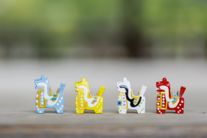 一体一体表情の異なる福馬みくじ各500.円は全8色。どの色が当たるかはお楽しみ