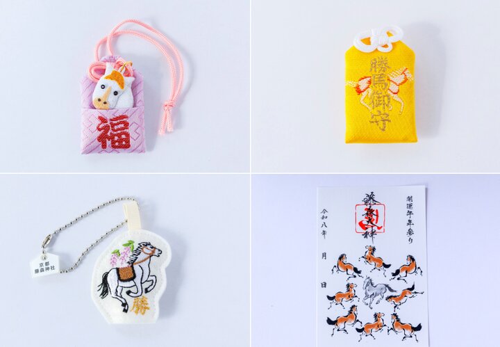 授与所には、「福」のポケットにちりめん製の馬が入ったキュートな「福馬守」や、「うまくいく守」、「勝馬守」など馬をモチーフにしたさまざまな授与品がそろいます。1800年もの時を超えて人びとを見守ってきた勝運の神様からご利益を授かりましょう。