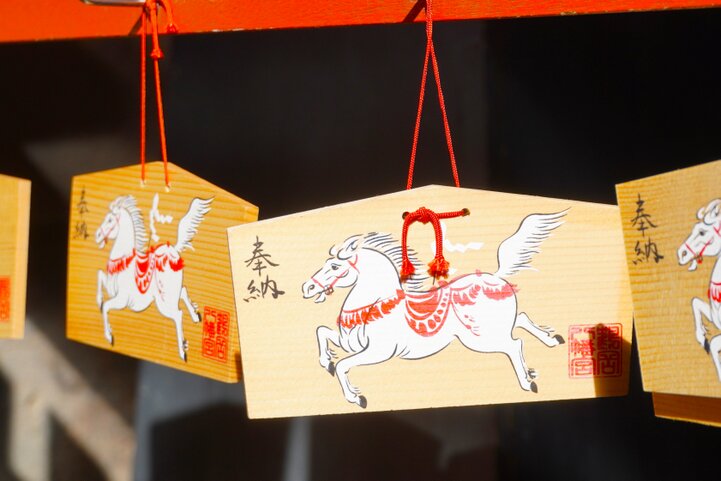 鶴岡八幡宮で授与される絵馬のうち、楼門の内側だけで頒布される特別な一枚があります。描かれているのは、2026年の干支でもある午(うま)。力強く駆ける姿が印象的で、新しい一年の願い事を託すのにふさわしい絵馬です。参拝を終えたら、そのまま楼門の内側で願い事を書き、本殿横の絵馬掛所に納めてみてはいかがでしょうか。