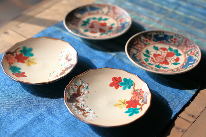 手前が桜と赤紅葉、青紅葉を一緒に描いた、雲錦手の銘々皿