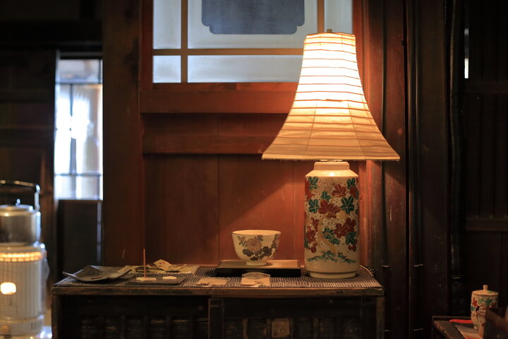 店内ではティーカップや茶器などの作品が展示されているほか、よく見るとランプシェードや洗面台、トレイなど、さまざまなところに犬山焼が。赤絵や呉須の華やかながら優しい色目が、古民家の雰囲気ともよく合っていましたよ。