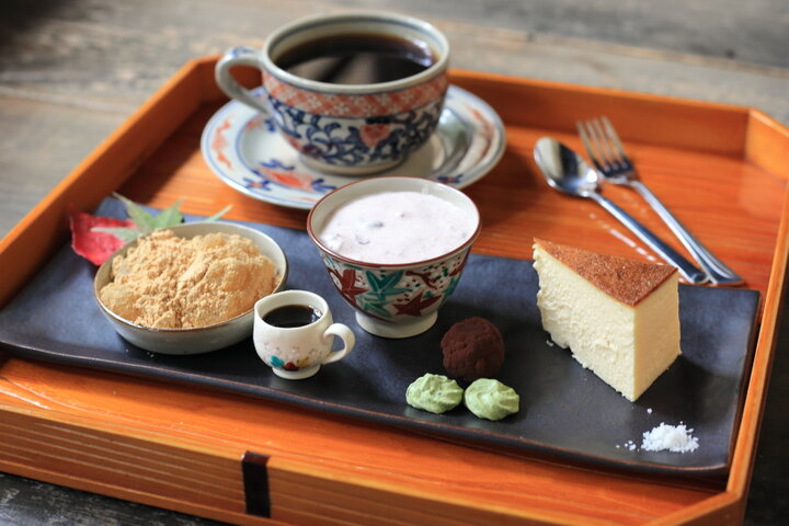 お茶請けのケーキや和菓子も窯元を守る尾関家の皆さんが手作りしていて、なかでもおすすめは「わらびもち」。犬山の人気居酒屋「だるま」さんの人気デザートとなっているわらび餅のレシピを特別に教えてもらい、オーダーごとに作っています。仕上げには犬山名物げんこつ飴を作る「藤沢げんこつ」さんに分けてもらったきな粉をたっぷりかけた、犬山らしい一品です。