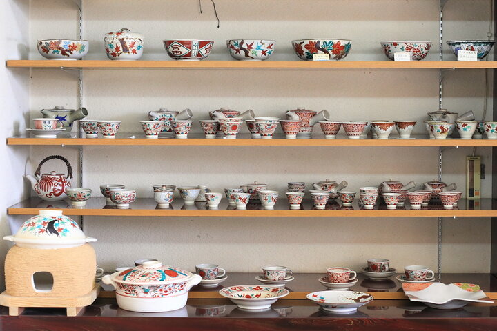 店内にはさまざまな犬山焼が展示されていますが、犬山焼の一番の特徴は鮮やかな赤絵。鳥や植物を文様のように描いた絵付の美しさで知られています。なかでも「雲錦手(うんきんで)」と呼ばれる桜と紅葉を一緒に描いた絵付は、季節問わず使えるようにと考えられたもので、これにより犬山焼が多くの人に親しまれる器になったのだそう。