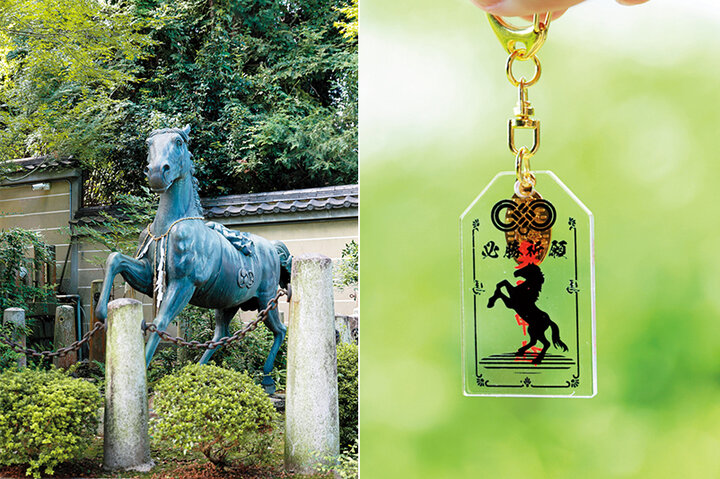 干支にちなみ、参道で迎えてくれる明治時代に奉納された神馬像にもお参りを忘れずに。旅立守護お守りやうまおみくじなど、馬に関する授与品もあります。 「必勝祈願のひだり馬お守り」は、馬は右から乗るとつまずいて転ぶという習性があり、「左馬は倒れない」として必勝、成功を得るとされています。持っているだけで気持ちも明るくなりそうですね。