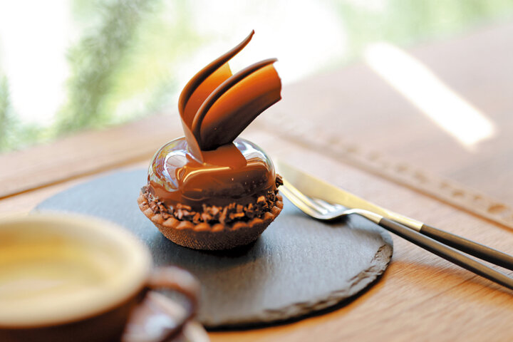 タルトショコラ972円。チョコレート細工の美しいグラデーションにも注目