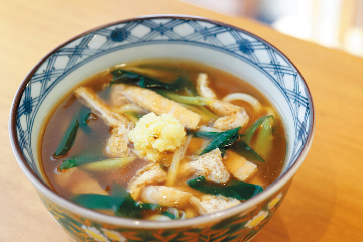 「衣笠丼」は、卵とご飯の間に揚げと九条ネギが入る珍しいタイプ。 「たぬき」は、甘く炊いた刻んだ揚げと九条ネギを散らしたあんかけうどん。おろし生姜が、散策で冷え切った体をぽかぽかと温めてくれますよ。