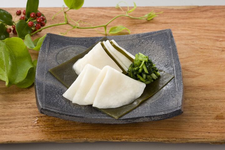 千枚漬100g 864円。 聖護院かぶらをスライスし、塩で下漬した後、北海道昆布と調味液に漬け込む