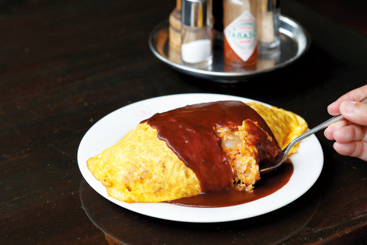 ドビソースをたっぷり味わえる、オムライス(中) 1380円。中は牛肉と豚肉が入ったケチャップライス