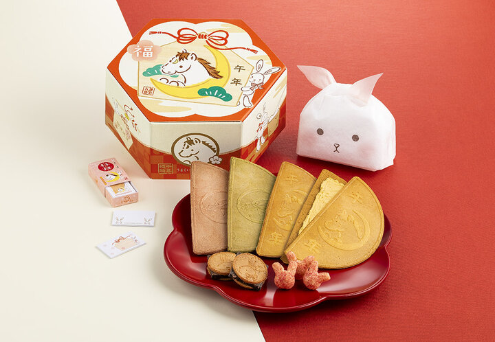 「鎌倉五郎本店」 では、うさぎスイーツがぎっしり入った『午年福BOX』を2025年12月18日~2026年1月上旬ごろまで販売しています。 鎌倉五郎のシンボル“月うさぎ”が、おいしいスイーツと一緒に新年のご挨拶。毎年大好評の『干支半月』や代表作『鎌倉半月』、しゃりしゃり食感が楽しい『鎌倉チョコサンドだょ』、可愛らしい『うさいちご』が入ったおめでたい新春限定BOXです。さらに、今年の干支を描いた『午年半月』そっくりのキュートなオリジナル付箋付きです。 【商品名】午年福BOX 【内 容】鎌倉半月(抹茶風味 3枚、小倉風味 3枚)、午年半月[栗きんとん味]3枚、鎌倉チョコサンドだょ 4個、うさいちご 1袋、ミニ箱入付箋 1個 【取扱店】鎌倉五郎本店 各店 (小町通り本店、大丸東京店、羽田空港第1ターミナル店)、パクとモグ 小田急町田店、ぶどうの木&鎌倉座 阿佐ヶ谷店 【期 間】2025年12月18日(木)~2026年1月上旬頃