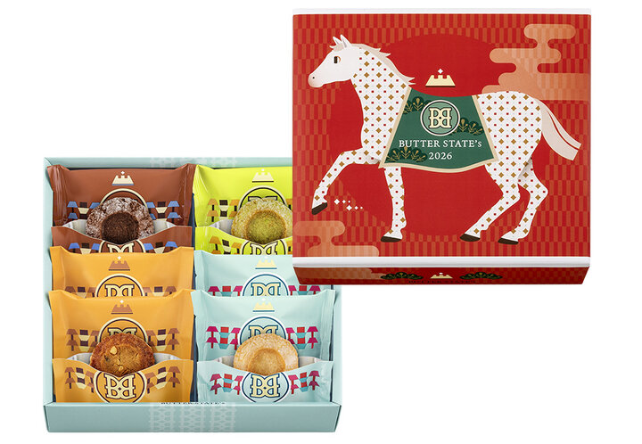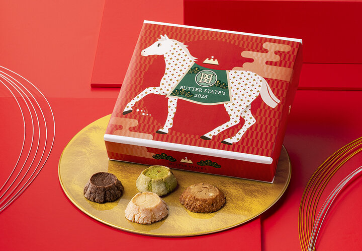 バタースイーツ専⾨店「バターステイツ by銀のぶどう」では、2025年12月26日から、年末年始限定で『バターステイツ 4種10個入 午年パッケージ』が新登場。おめでたい紅白カラーの中央には、幸運を呼び込むといわれる“白い馬”が。「今年もきっとうまくいく」そんな気持ちを込めたギフトです。 厳選配合したトリプルブレンドバターをたっぷり練りこみ、窯の熱でバターが溢れとろける独自の“バターなだれとろけ製法”でどこまでも香ばしく焼き上げた、バターリッチクッキー。バターステイツ自慢の美味しさを堪能できるギフトです。バター含有率34%を誇る代表作『THEバターリッチ』に、コク深い『キャラメルナッツバター』、芳醇なココアの香りがたまらない『ショコラバター』、風味豊かな『ピスタチオバター』の4味セットです。 【商品名】バターステイツクッキー 4種10個入 午年パッケージ 【内 容】THEバターリッチ 3個、キャラメルナッツバター 3個、ショコラバター 2個、ピスタチオバター 2個 【取扱店】バターステイツ by銀のぶどう 各店(大丸東京店・西武池袋店・ジェイアール名古屋タカシマヤ店)、シュガーバターの木 エキュート大宮 ノース店、ぶどうの木&鎌倉座 阿佐ヶ谷店 【期 間】2025年12月26日(金)~2026年1月上旬頃まで