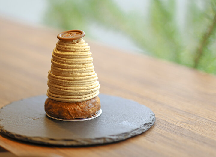 毎年9月ごろから販売が始まり、その年に収穫した栗がなくなると販売も終了するというモンブランは、午前中になくなることもあるという幻のケーキ。 熊本産の栗の風味を生かせるやさしい味わいのミルクチョコレートが使われ、中のメレンゲはサクサク。和栗の香りが、どことなく和菓子を思わせるようなお菓子です。