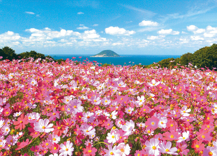 海を背景に花畑が広がる「のこのしまアイランドパーク」