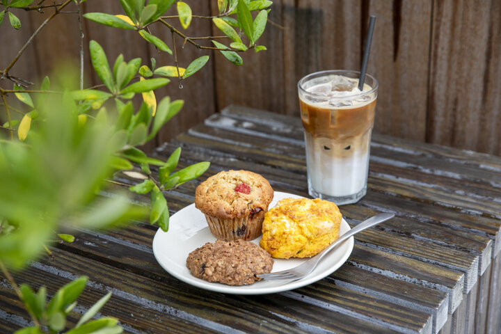 左上から時計回りに「イチゴと小豆のマフィン」(480円)「カボチャのスコーン」(420円)「クッキー」「カフェラテ アイス」(750円)