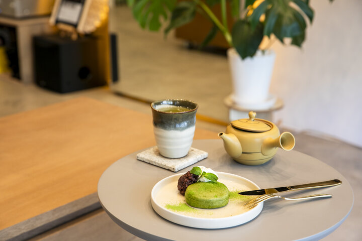 お茶によく合うお菓子は、「胡桃のケーキ」や自家製「濃厚抹茶バスクチーズケーキ」などがあり、「宮崎の抹茶まん」もおすすめです。宮崎県産の有機抹茶を贅沢に使用し、モチモチとした外皮でずっしりとした抹茶白餡を包みます。生クリームと小豆餡をたっぷりつけて召し上がれ。