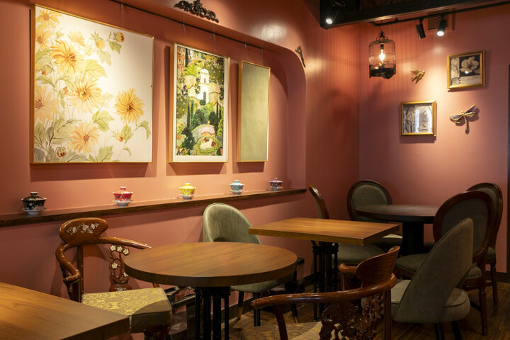 2階がカフェになっていて、シャンデリアやクラシカルな磁器などはすべて現地で買い付けたもの。天井からこぼれる柔らかな灯りが、異国情緒とノスタルジーを優しく照らします。歩き疲れた午後にふらりと立ち寄りたくなる、静かな場所です。