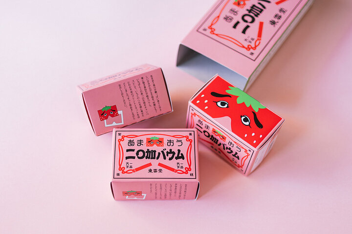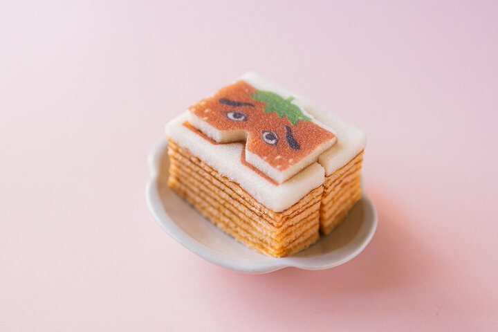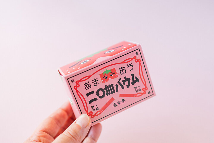 「あまおう二〇加バウム」は、福岡県産のブランドいちご「あまおう」を使った見た目にもたのしいバウムクーヘン。 バウムクーヘンには、福岡の郷土演芸「博多仁和加(はかたにわか)」の「にわか面」のデザインをプリント。いちごの顔をしたにわか面には、いちごのヘタやつぶつぶまで表現されていて、愛嬌たっぷり。伝統と遊び心が融合した、福岡でならではのスイーツです。