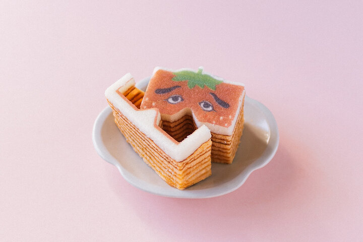 ひと口味わう前に、まずは型ぬきをしてみるのも、このお菓子ならではのたのしみ方。 ひと口食べると、しっとりとした生地に、ふんわりとあまおうの風味が広がります。生地には福岡県産あまおういちごを使用。メレンゲをつかった白生地を重ね合わせて作った生地は、軽やかで口どけのよい食感になっています。
