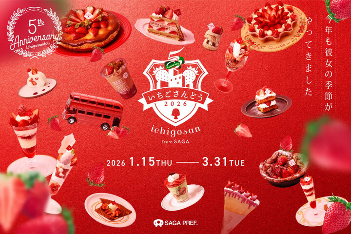 表参道のカフェ・レストラン12店舗では、佐賀のブランドいちご「いちごさん」とコラボレーションした「いちごさん」メニューを提供する「いちごさんどう2026」を、2026年1月15日(木曜日)の「いちごの日」から、3月31日(火曜日)まで2か月間に渡り開催します。 今回のメニューは、「いちごさん」を贅沢に使ったタルトやミルクレープ、アップルパイ、ミルフィーユといった王道スイーツに加え、見た目にも華やかなスペシャルパフェが登場。さらに、ダッチベイビーや抹茶ムース、スコーンなど、幅広いラインアップを楽しめます。ドリンクには、「いちごさん」のやさしい甘さを引き立てるソーダやSNSで話題のミルクティーが登場。さらに、5周年を記念したスペシャル企画も予定しています。