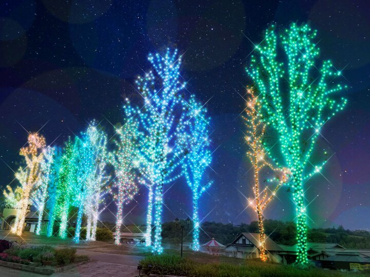 ハーベストの丘では、約100万球のイルミネーションが灯る「Wonder Night Hill 2025」を開催。15m以上の高さを誇るメタセコイアのイルミネーションをはじめ、シャンパンゴールドに輝く吊り橋、傾斜を利用したエリアなど、地形や樹木を活用した演出が楽しめます。カピバラや羊など園内の動物をモチーフにした牧場エリアなどハーベストの丘らしさをコンセプトにデザインしています。 また、例年イルミネーションイベントの夜間には閉鎖していた村のエリアの一部を新たに開放し、遊べるエリアを拡大。 ドッグランもライトアップすることで、大人から子ども、そしてペットまで一緒に楽しめるイルミネーションイベントになっています。