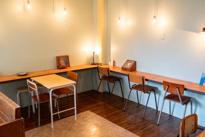 ほかのお客さんと目線が合わないように壁際に席を多く配置するなど、ひとりでくつろげる工夫がされた店内。おひとりさまはもちろん、テーブル席やふたりがけのベンチもあるので、友達や家族との時間を楽しむこともできますよ。