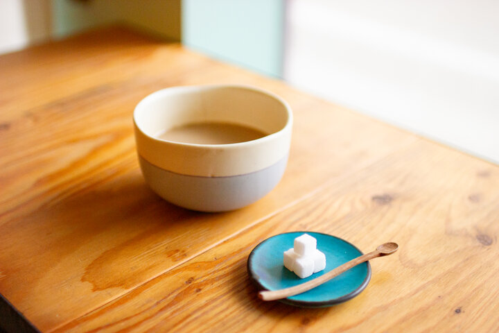 「お茶とお菓子セット」は、おしるこや牛乳ゼリー、ケーキなどの6種類のお菓子と、コーヒーや紅茶など9種類の飲み物からそれぞれ好きなもの選ぶスタイル。 冬に人気の「あたたかいおしるこ」は、小さめの白玉と甘酒が入っていて、心も体も温まります。毎朝手作りしているという白玉は、もちもち・ふんわりしていて絶品。盛りつけたときに見た目がかわいくなるよう、器に対して小さめに作っているそうですよ。 おしるこに甘酒を入れるというアイデアは、和菓子屋で働く息子さんがアドバイスしてくれたそう。甘酒が入ることで風味が良くなり、甘さ控えめのあんこともマッチして、ほかでは味わえないおいしさです。