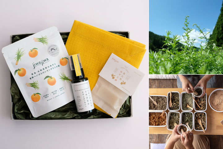 まずおすすめしたいのは、奈良・奥大和の自然から生まれた「jiwajiwa」の「お風呂とアロマのセット」。 古くから薬草文化が根付く土地で、無農薬の薬草を使い、丁寧に作られた入浴用ハーブ。 巾着を湯船でそっと揉むと、ふわりと立ち上がるのは、草木そのもののやさしい香りです。