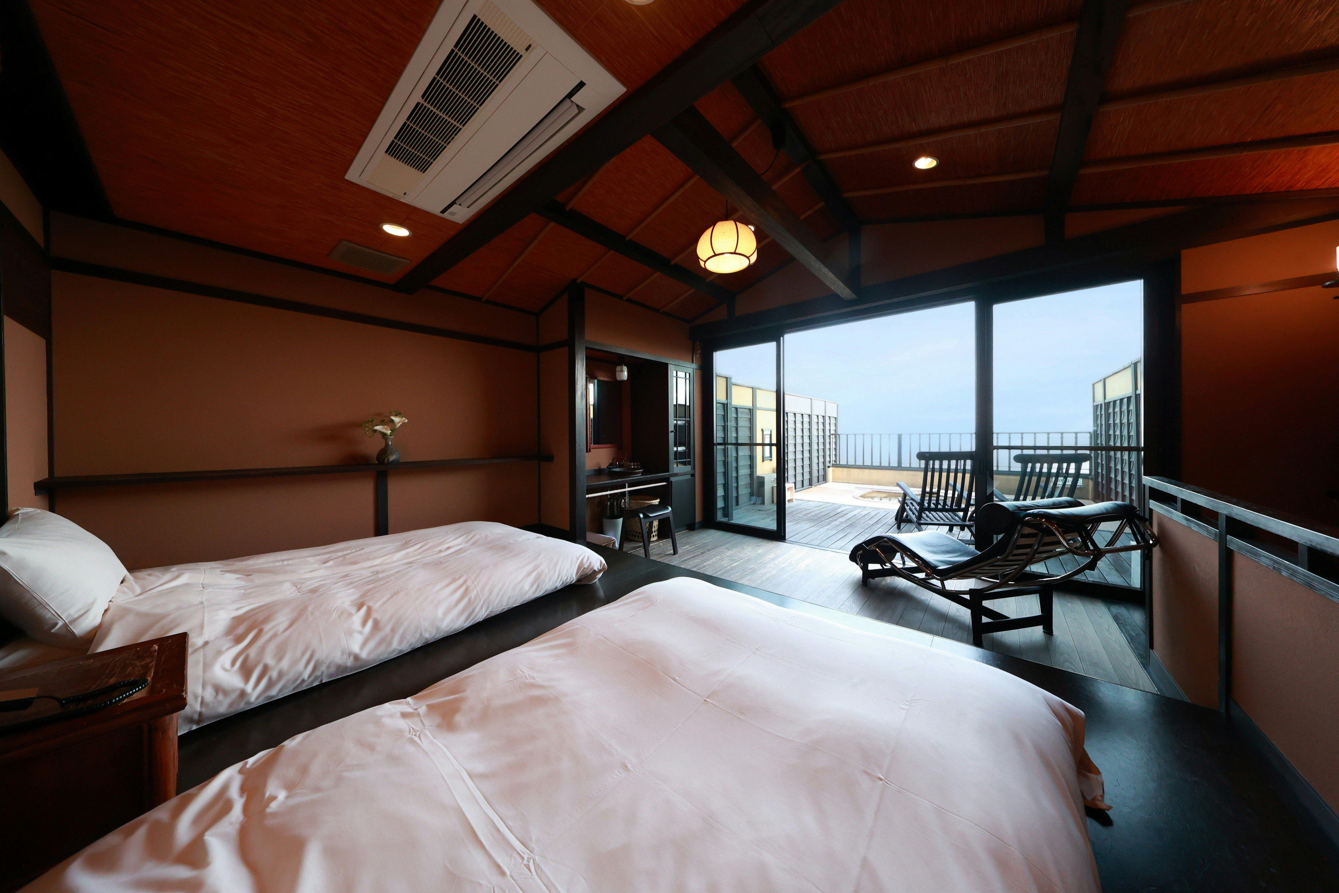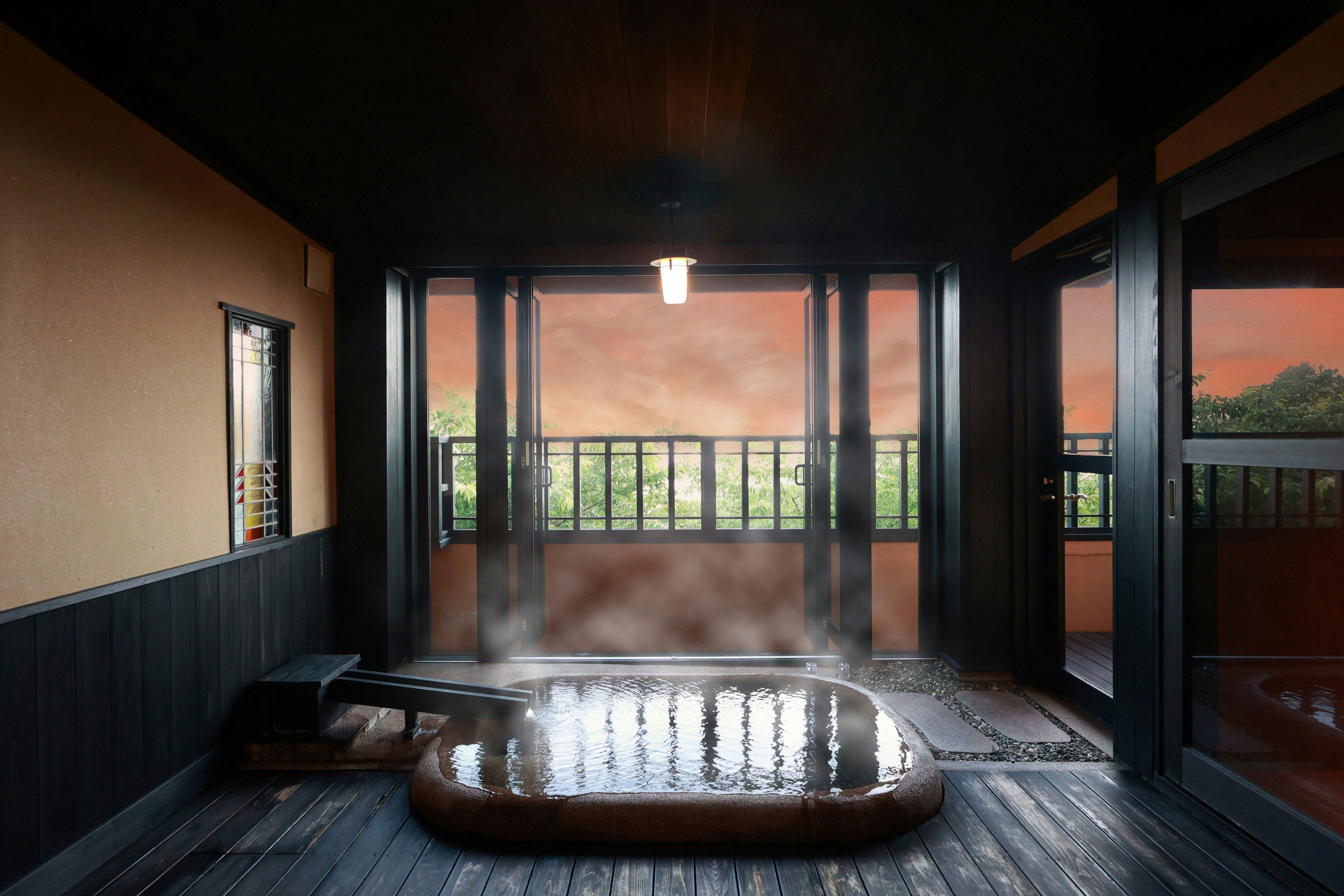 大室山の麓、日々の雑踏から離れ、湯に食に至福の一時へと導いてくれる全6室の離れの宿「お宿うち山」。全室メゾネット式の客室は、古風な木造りの居心地よい空間。1階には10帖の和室の他、広縁またはゆったりとしたお風呂・囲炉裏のあるお部屋などが有り、2階には寝室と海や伊豆の山々を一望できる大パノラマの展望露天風呂が、全室に配されている造りに。湯船からは太陽に照らされた海山の絶景と、夜は満天の星空が楽しめます。