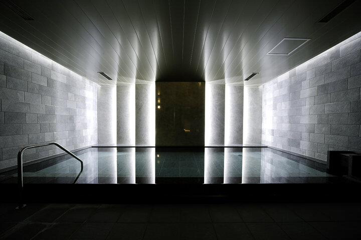 寒い冬場の旅行にうれしいのが、街ナカの立地で宿泊者専用の大浴場があるところ。間接照明の穏やかな光に包まれ、心静かに湯浴みが楽しめる空間です。洗い場には、客室と同じ「ハンスグローエ」のシャワーと「ゼミド」のバスアメニティも。手足を伸ばしてゆっくり湯に浸かれば、冷えた体も芯からポカポカに。一日の疲れをしっかり癒やせます。