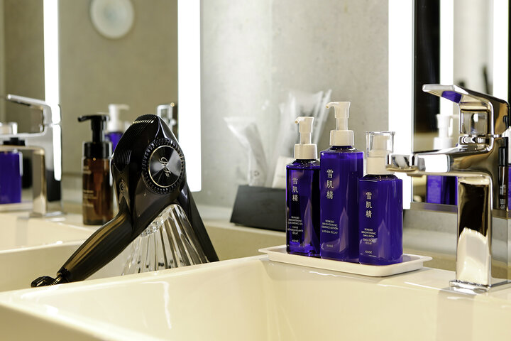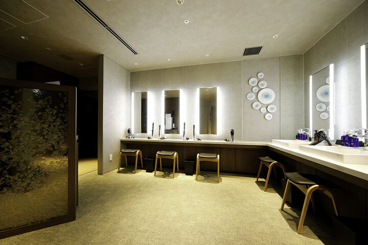 女性用のパウダールームは、「ReFa(リファ)」のドライヤーやヘアアイロン、「雪肌精」の基礎化粧品とアメニティも充実。鏡はすべて女優ミラーなので、お風呂上がりの身支度やおでかけ前のスタイリングも快適です。客室から大浴場へはナイトウェアとスリッパで移動できるのも、地味にうれしいポイント。男性浴場はルームキーで、女性浴場はチェックイン時に渡される暗証番号で解錠する仕様なので、セキュリティ面も安心です。