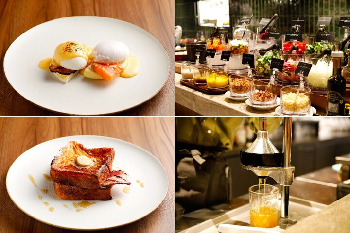 洋食派の方は、ザ・ゲートホテル定番のエッグベネディクトかフレンチトーストを。エッグベネディクトは、ポーチドエッグとソースに下川町のブランド卵を使用。スチームコンベクションでプリンのような食感に焼き上げたフレンチトーストは、甘みとベーコンの塩味のバランスが絶妙です。メイン料理を待つ間はサラダステーションへ。新鮮野菜やデリカテッセン、手搾りのフレッシュオレンジジュースなど、心躍るメニューがずらり。