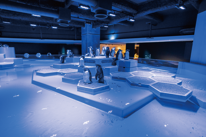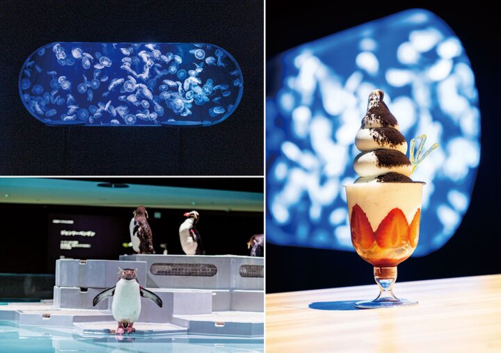 (右)館内でキタイワトビペンギンをイメージしたパフェが味わえる