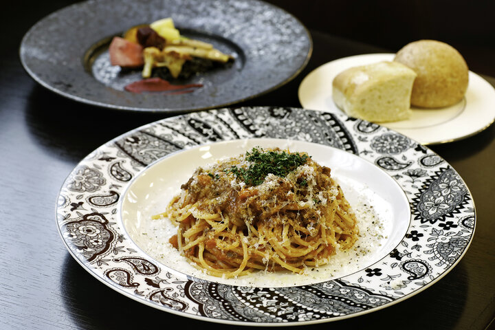 蝦夷鹿肉と香味野菜のトマトラグーパスタ。サラダと道産小麦のパン付きで1980円