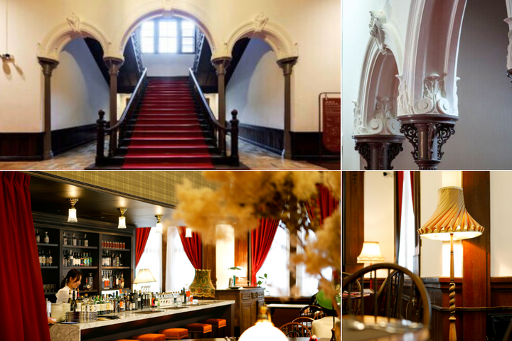 (左上)(右上)正面玄関入ってすぐの大階段。三連アーチや階段の親柱などに施された彫刻が美しい(左下)(右下)優雅な気分で過ごせるレストラン