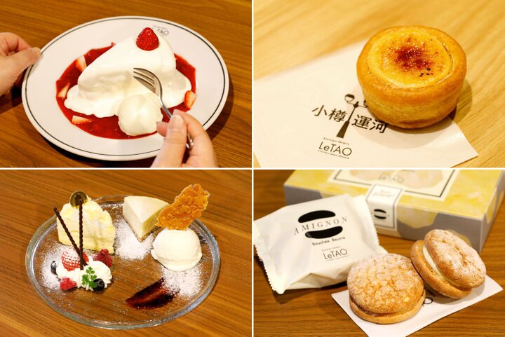 (左上)数量限定の「とろとろ生ショート」ドリンクセット1900円(左下)「運河スイーツプレート ドゥーブルフロマージュ」ドリンクセット1800円(右上)「オタルタ」500円(右下)お土産には「アミニョン」4個入1296円を