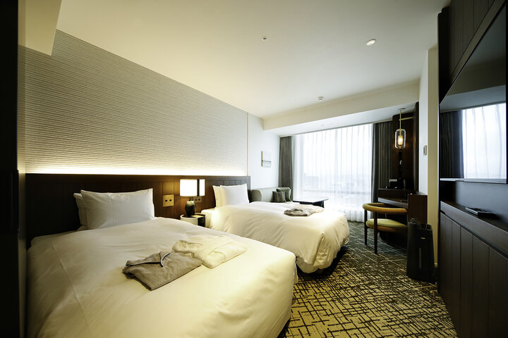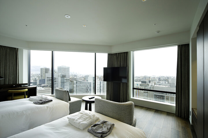 客室は11階から20階に全6タイプがあります。豊かな自然と都市が調和した札幌らしく、どのお部屋もインテリアはアースカラーが基調。窓の外に広がる街並みとシームレスにつながる心地良い空間です。おすすめは、さっぽろテレビ塔を望む「Classy(クラッシー)」のツイン。窓辺のソファに身を委ね、大通・すすきの方面の夜景をのんびり眺めるのも楽しいひとときです。洗面台とベッドルームは引き戸で仕切れるため、ふたり旅でも入浴や着替えに気を遣うことなく過ごせます。