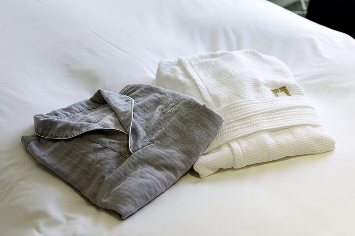 お部屋の備品やアメニティもこだわり抜いたものばかり。ベッドには、英国王室御用達のベッドブランド「スランバーランド」のオリジナルマットレスを導入し、寝心地の良さは格別。ナイトウェアは二重ガーゼのやさしい着心地で、朝までぐっすり眠れそうです。「Classy」以上のランクの客室には、フード付きのバスローブも用意しています。