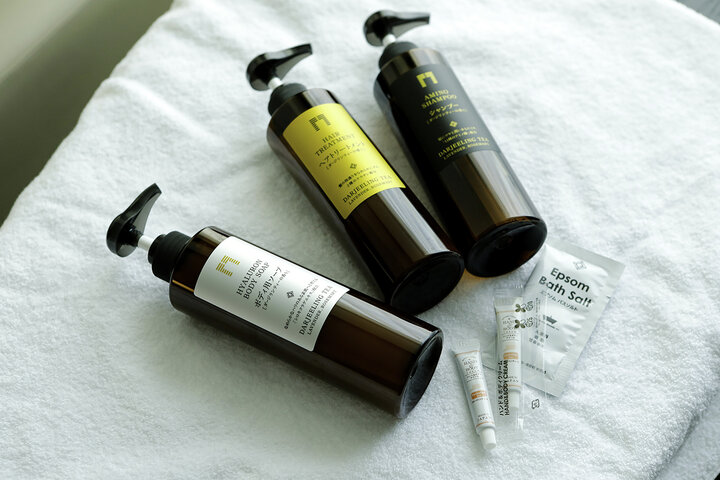 さらにバスルームには、肌当たりが柔らかなドイツの老舗メーカー「ハンスグローエ」製のシャワーと、天然由来の原料を使用した国内発の自然派コスメブランド「ゼミド」のバスアメニティも。このシャンプーやボディソープは気品あるダージリンティーの香りにこだわって開発したもので、女性に人気なのだそう。アメニティには、同じ香りのハンド&ボディクリームもあるので、ぜひ使ってみてくださいね。