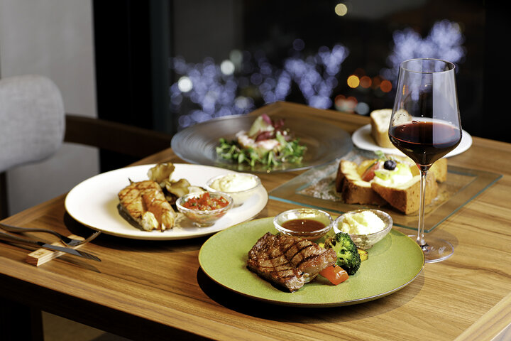 ディナーはメインダイニング「Anchor Grill Sapporo(アンカーグリルサッポロ)」で。北海道の厳選食材を使ったグリル料理を、コースやアラカルトで楽しめます。今回いただくのは、前菜を1皿、メインを2皿選べる全6品の「セレクトディナーB」。グリル料理のソースにデザートも自分好みにカスタムできるのが魅力です。