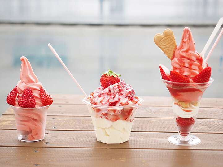 ソフトクリーム(左)や凍らせて削ったもの(中央)、パフェなど、いちごづくしがたまらない