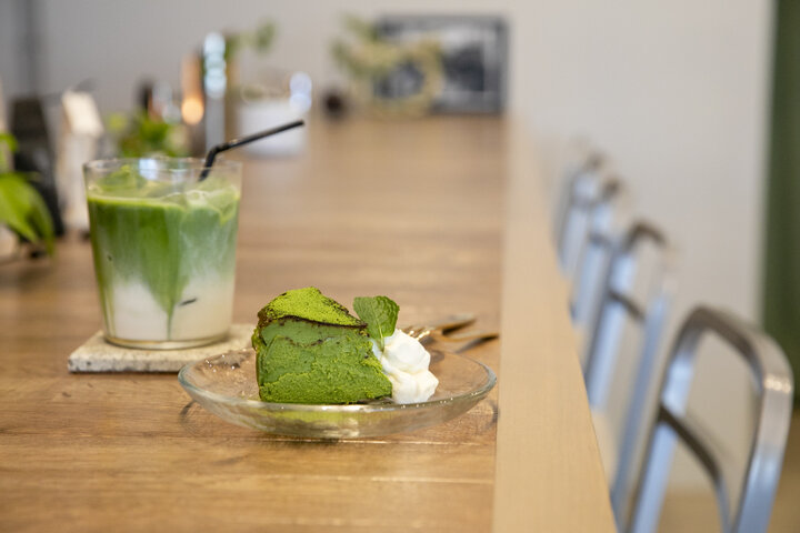 抹茶好きおすすめの「抹茶ラテ」は、宮崎県産の有機抹茶を使用し香り高く、ミルクと合わせても風味が失われません。オーダーごとに茶釜から柄杓で湯をすくい、抹茶を点て、ミルクへと注ぐ。その一連の流れをカウンター越しに眺める時間も、この店の楽しみの一つです。同じ抹茶をたっぷり使った自家製の「抹茶バスクチーズケーキ」といただくと、より抹茶の深みが印象に残ります。濃い色合いは、その分量の証。しっとりとした口当たりとともに、余韻がゆっくりと広がっていきます。