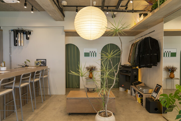 元町のそばに佇む日本茶とアパレルの店「no count」。ガラス越しに見える店内は、コンクリートの壁と床を基調にしながらも、カウンターや棚に使われた木が全体をやわらかく整えます。カウンターの反対側にはユニセックスのアパレルが並び、服を選ぶ時間とお茶を味わう時間が、同じ空気の中で流れていきます。